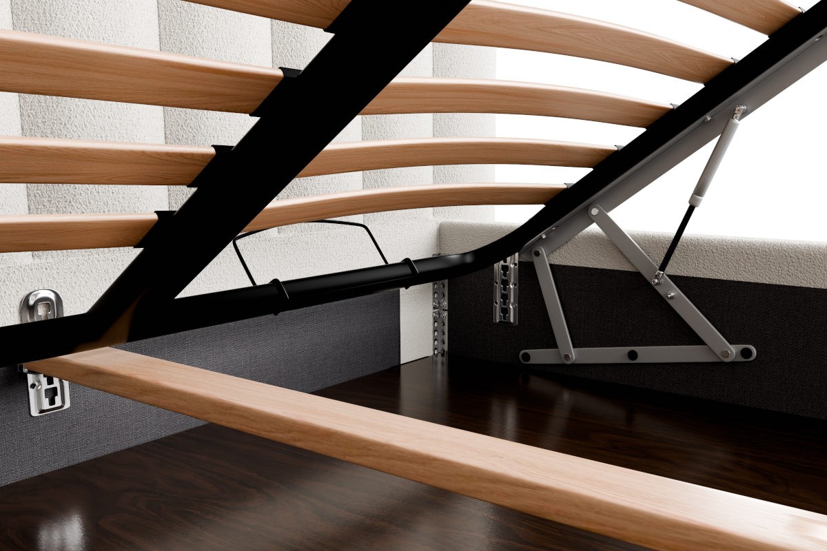 Základňa FRAME LIFT je komplexným riešením pre vašu spálňu, rám obsahuje úložný priestor a rošt na posteľ typu LIFT, ktorý umožňuje prístup práve do úložných priestorov. Dosky ÚP sú umiestnené na kovovej podpere, ktorá zabezpečuje stabilitu a odolnosť postele. Rošt je k základni pripevnený pomocou plynových piestov, ktoré pri manipulácii nevydávajú žiadne nepríjemné zvuky a ich používanie je veľmi pohodlné.