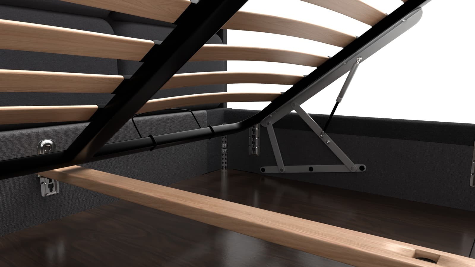 Základňa FRAME LIFT je komplexným riešením pre vašu spálňu, rám obsahuje úložný priestor a rošt na posteľ typu LIFT, ktorý umožňuje prístup práve do úložných priestorov. Dosky ÚP sú umiestnené na kovovej podpere, ktorá zabezpečuje stabilitu a odolnosť postele. Rošt je k základni pripevnený pomocou plynových piestov, ktoré pri manipulácii nevydávajú žiadne nepríjemné zvuky a ich používanie je veľmi pohodlné.