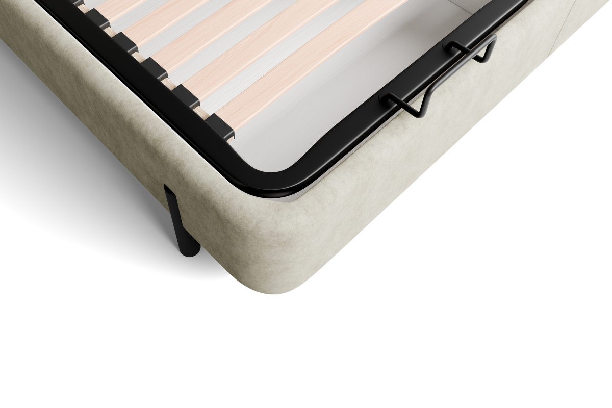 Základňa BOX FRONT LIFT je vybavená lamelovými zdvíhacími roštami, ktoré sú k základni upevnené kvalitným kovaním a zdvíhacím mechanizmom lift. Ponúka tak ľahký prístup do úložného priestoru, ktorý je súčasťou základne. Piesty zdvíhacieho mechanizmu sú tlakové, nehrozí teda nepríjemné vŕzganie pri otváraní a zatváraní úložného priestoru. Na vytvorenie postele snov, ju možno vyrobiť v rôznych látkach aj farbách z našej ponuky.