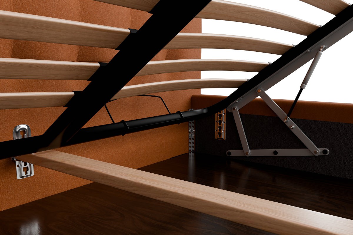 Základňa FRAME LIFT je komplexným riešením pre vašu spálňu, rám obsahuje úložný priestor a rošt na posteľ typu LIFT, ktorý umožňuje prístup práve do úložných priestorov. Dosky ÚP sú umiestnené na kovovej podpere, ktorá zabezpečuje stabilitu a odolnosť postele. Rošt je k základni pripevnený pomocou plynových piestov, ktoré pri manipulácii nevydávajú žiadne nepríjemné zvuky a ich používanie je veľmi pohodlné.