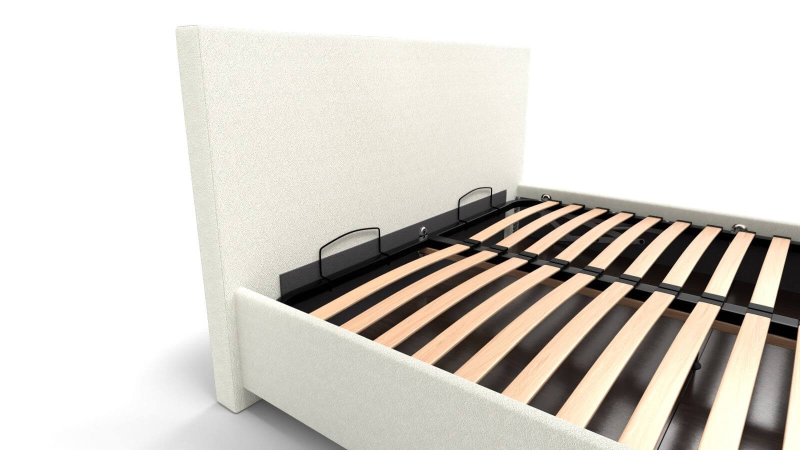 Rámová základňa FRAME STORAGE obsahuje úložný priestor, do ktorého môžete uložiť všetko, čo budete potrebovať. Dosky sú vyrobené z vysokokvalitnej MDF dosky, ktorá je odolná, a sú umiestnené na kovovej výstuhe základne pre zvýšenie nosnosti a stability. Tento typ základne neobsahuje rošt, takže je vhodný napríklad pre zákazníkov, ktorí uprednostňujú polohovateľné rošty.