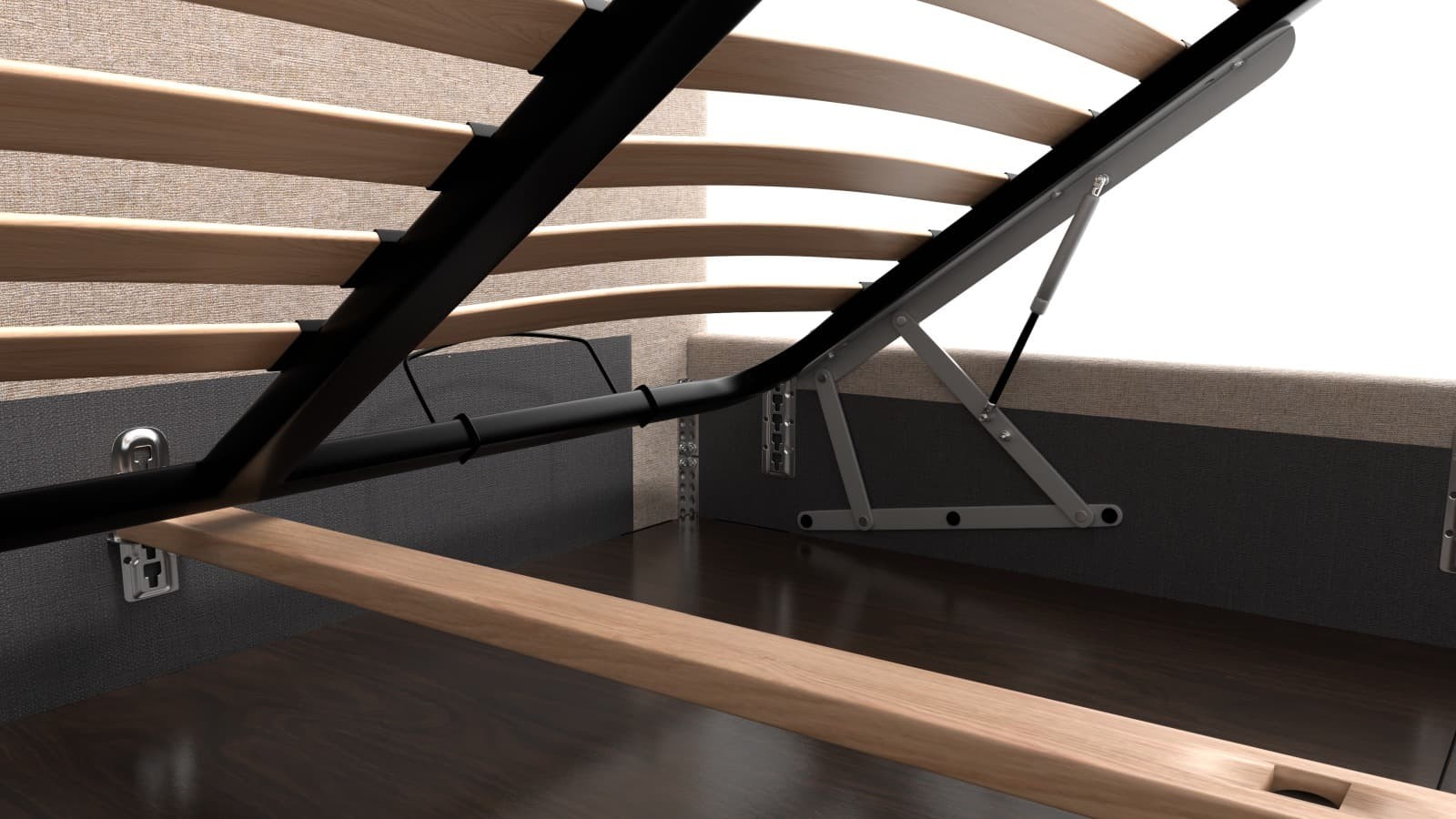 Základňa FRAME LIFT je komplexným riešením pre vašu spálňu, rám obsahuje úložný priestor a rošt na posteľ typu LIFT, ktorý umožňuje prístup práve do úložných priestorov. Dosky ÚP sú umiestnené na kovovej podpere, ktorá zabezpečuje stabilitu a odolnosť postele. Rošt je k základni pripevnený pomocou plynových piestov, ktoré pri manipulácii nevydávajú žiadne nepríjemné zvuky a ich používanie je veľmi pohodlné.