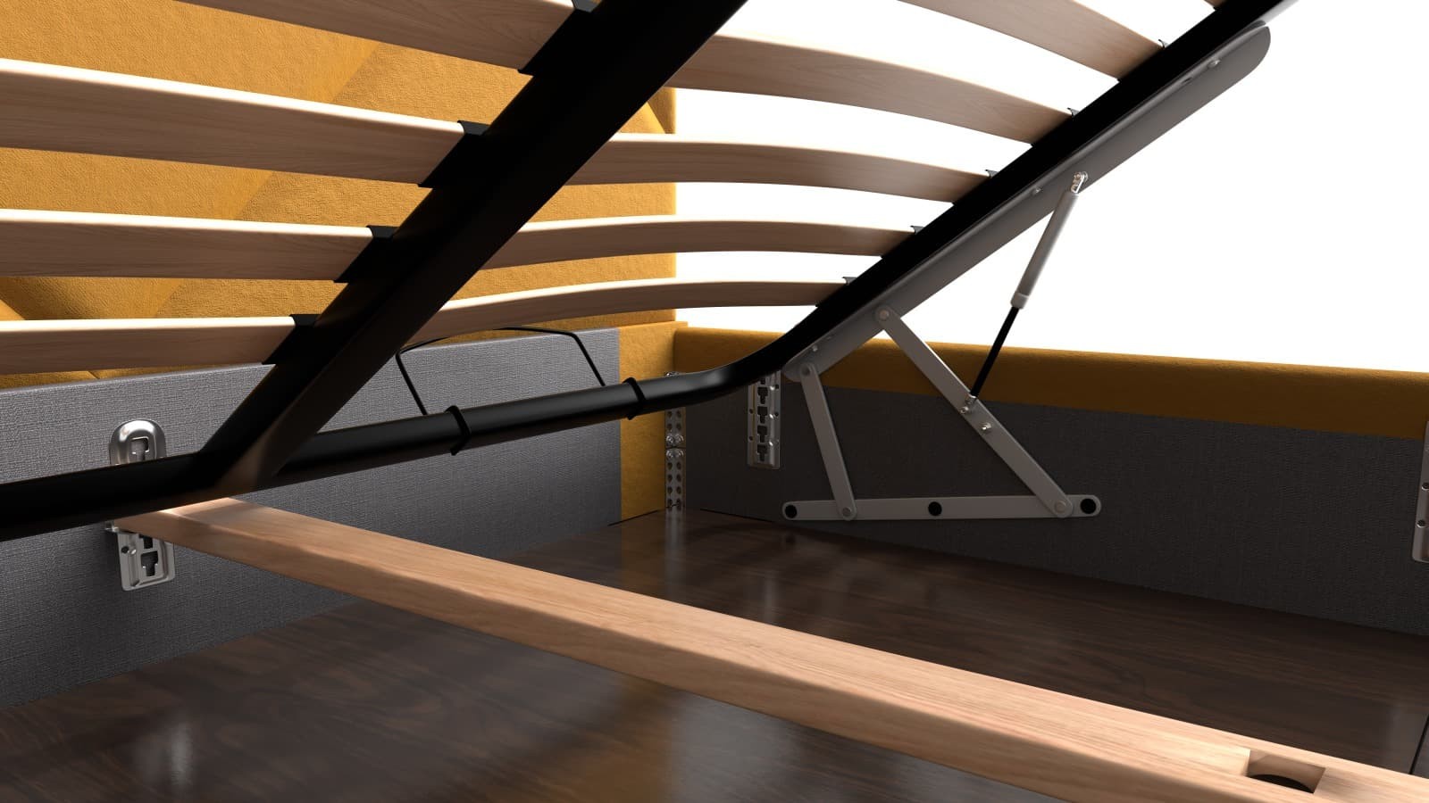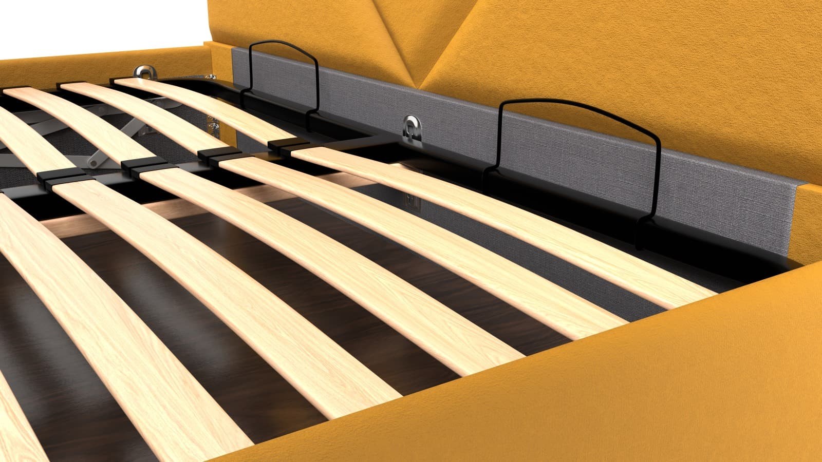 Základňa FRAME LIFT je komplexným riešením pre vašu spálňu, rám obsahuje úložný priestor a rošt na posteľ typu LIFT, ktorý umožňuje prístup práve do úložných priestorov. Dosky ÚP sú umiestnené na kovovej podpere, ktorá zabezpečuje stabilitu a odolnosť postele. Rošt je k základni pripevnený pomocou plynových piestov, ktoré pri manipulácii nevydávajú žiadne nepríjemné zvuky a ich používanie je veľmi pohodlné.
