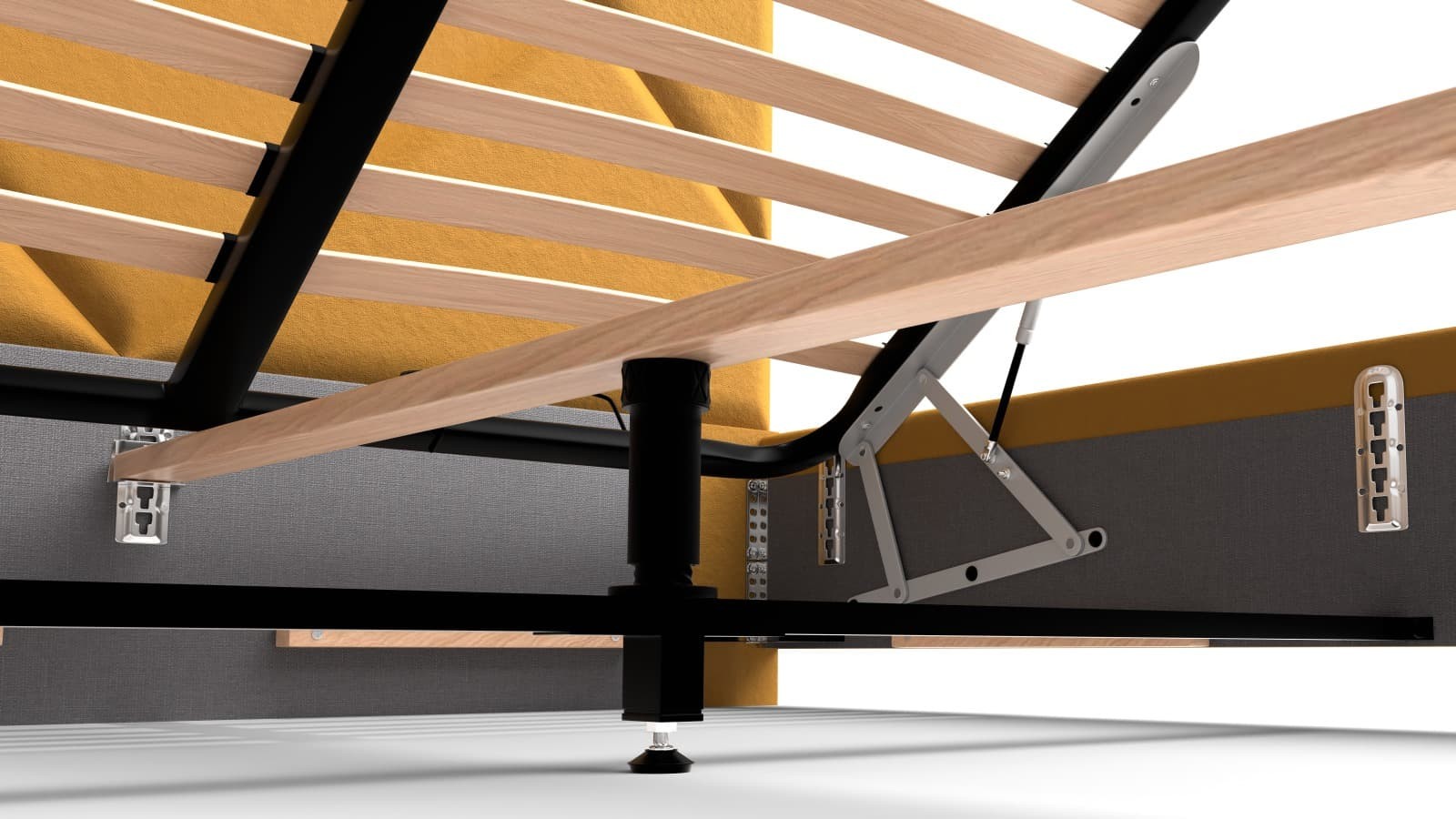 Rámová základňa FRAME STORAGE obsahuje úložný priestor, do ktorého môžete uložiť všetko, čo budete potrebovať. Dosky sú vyrobené z vysokokvalitnej MDF dosky, ktorá je odolná, a sú umiestnené na kovovej výstuhe základne pre zvýšenie nosnosti a stability. Tento typ základne neobsahuje rošt, takže je vhodný napríklad pre zákazníkov, ktorí uprednostňujú polohovateľné rošty.