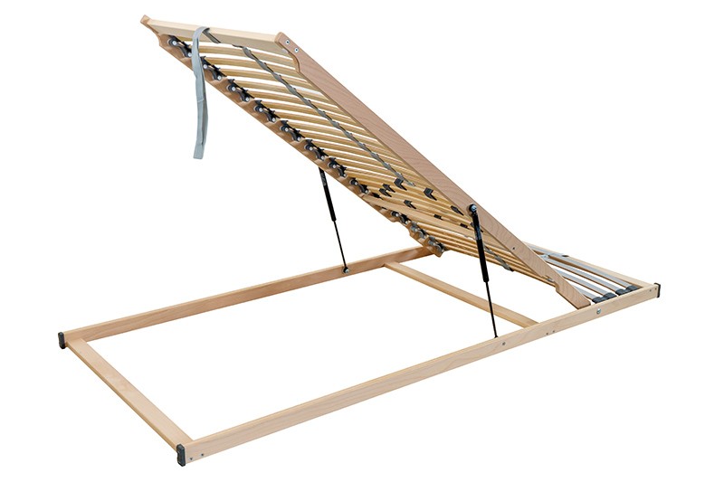Rošt s výklopom v nožnej časti pomocou piestového mechanizmu vám umožní prístup do celého úložného priestoru vašej postele. Rošt je možné jednoducho zdvihnúť vďaka odolnému textilnému úchytu. Pružné lamely uložené vo dvojiciach v kaučukových puzdrách sú rozložené do 5 anatomických zón. V ramennej oblasti nájdete vŕtané lamely, ktoré zaisťujú nižšiu tuhosť, tím zmierňujú tlak vyvíjaný na ramená. Stredový popruh zlepšuje stabilitu a zvyšuje nosnosť roštu. Posuvnými objímkami je možné individuálne nastaviť tuhosť v bedrovej časti roštu.