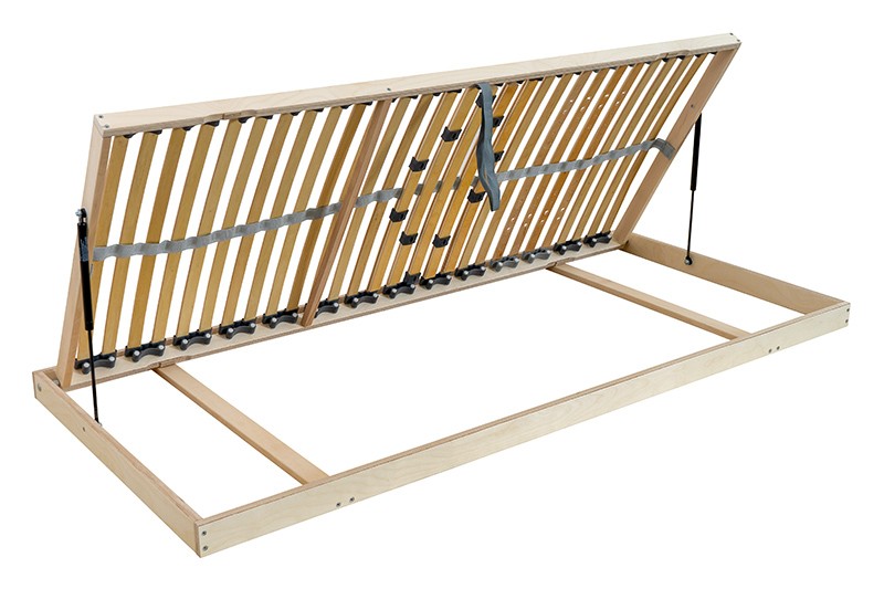 Lamelový rošt s bočným výklopom (rošt je možné objednať s výklopom ako na ľavú, tak na pravú stranu) vám poskytne prístup do celého úložného priestoru vašej spálne a vyrieši tak nedostatok miesta v miestnosti. Rošt je možné vyklopiť pomocou textilného úchytu, ktorý je odolný a vhodný aj na každodenné použitie. Pružné lamely uložené vo dvojiciach v kaučukových puzdrách sú rozložené do 5 anatomických zón. V ramennej oblasti nájdete vŕtané lamely, ktoré zaisťujú nižšiu tuhosť, tým zmierňujú tlak vyvíjaný na ramená. Stredový popruh zlepšuje stabilitu a zvyšuje nosnosť roštu. Posuvnými objímkami je možné individuálne nastaviť tuhosť v bedrovej časti roštu.